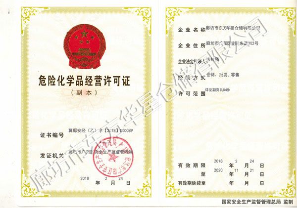 本公司危險品倉,是擁有合格的危險品化學品經營許可證的倉庫, 是天津地區屈指可數的擁有完備資質和先進設施的大型危險品專用倉庫。本公司具有危險品儲存資質許可證,在進行危險品倉儲作業中,可提供完善的裝卸機械設備,并配有專用工具,以確保危險貨物的安全及完好無損。同時,本公司還可根據用戶需要,為用戶提供具有危險貨物運輸資質的運力,以及以用戶運輸及保險業務等。